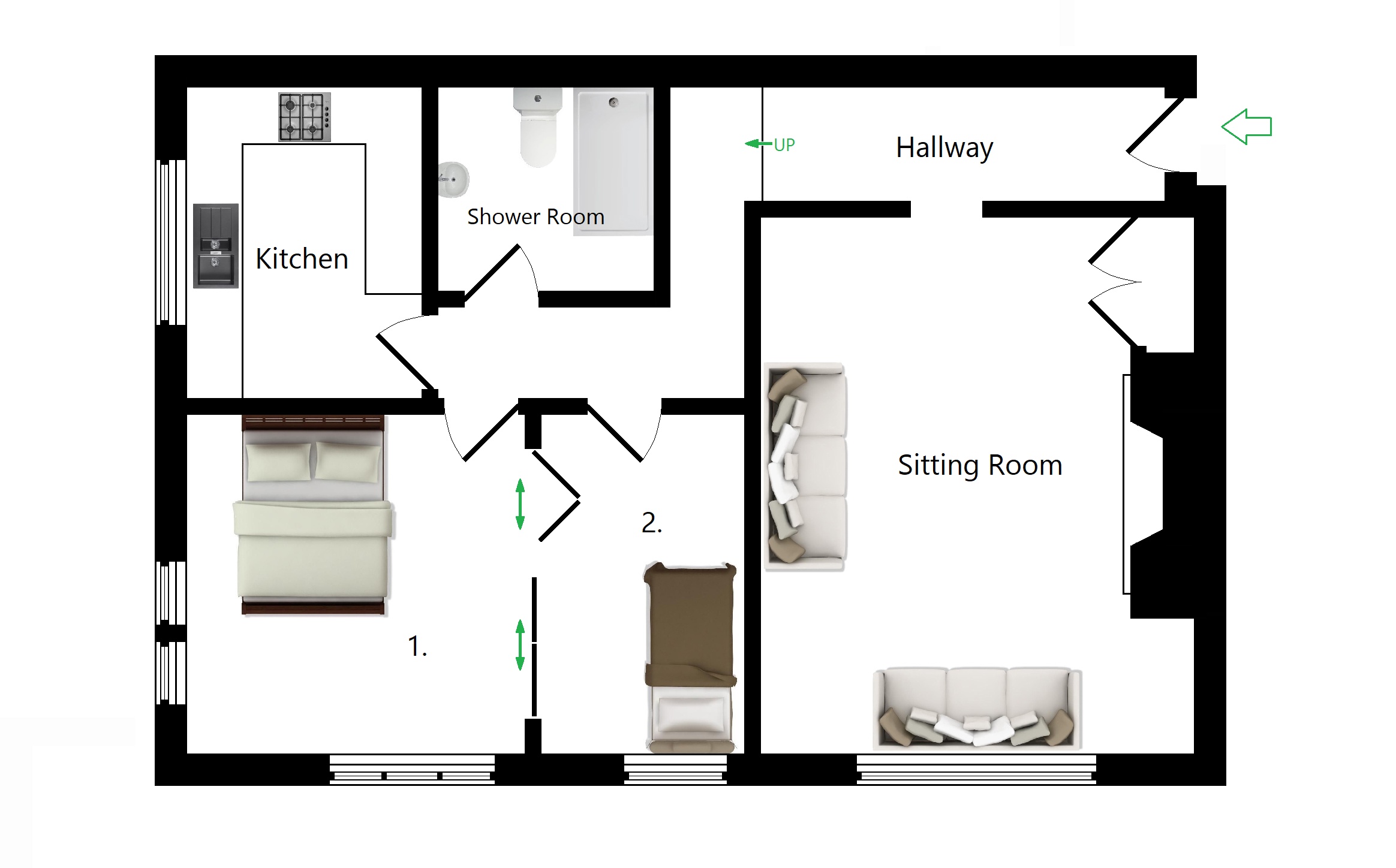 Entrance Hall Sitting Room: 17'1 x 11'8 (5.21m x 3.56m) Kitchen: 10'2 x 7'9 (3.10m x 2.36m) Shower Room: 7'2 x 6'10 (2.18m x 2.08m) Bedroom 1: 11'5 x 11'0 (3.48m x 3.35m) Bedroom 2: 11'0 x 6'10 (3.35m x 2.08m)