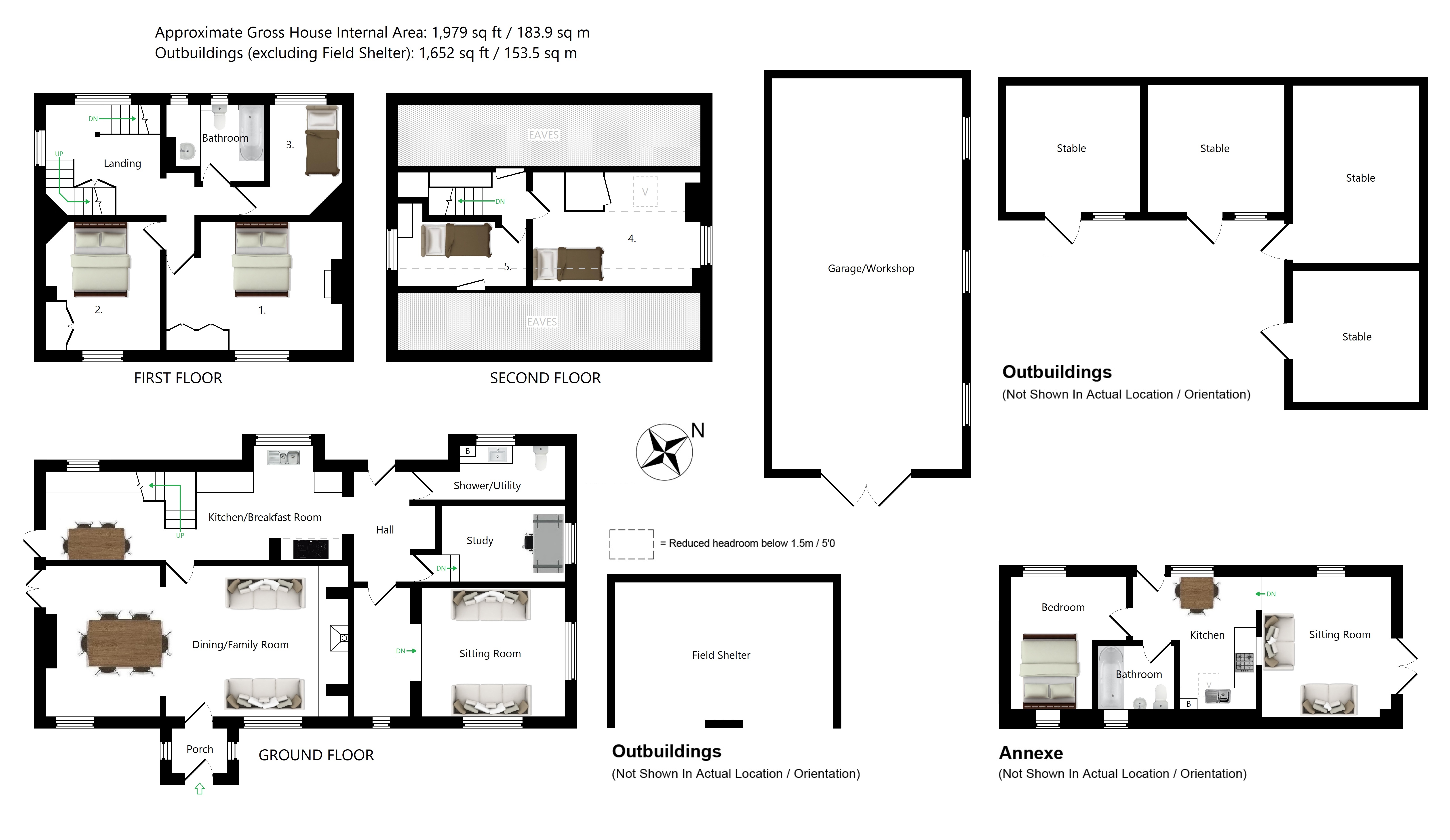 Garage: 35'4 x 17'2 (10.77m x 5.23m) Stable Block 3 x 12' boxes, 1 x 16' box Field Shelter: 13'1 x 13'1 (3.99m x 3.99m)
