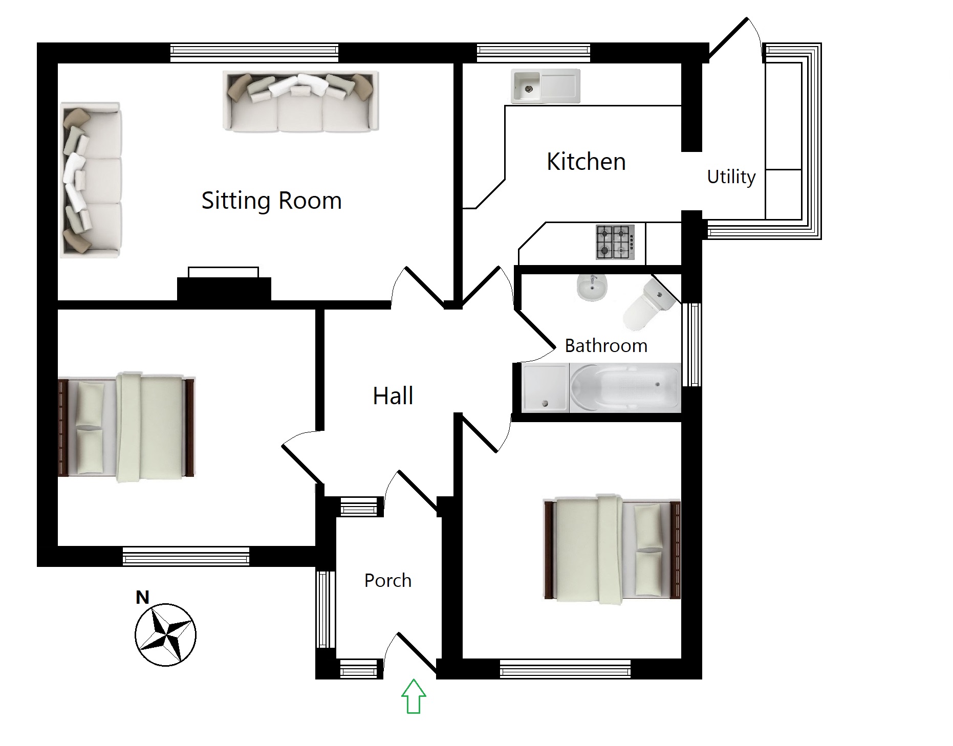 Porch: 6'11 x 4'7 (2.11m x 1.40m) Entrance Hall: (L-Shaped 9'7 x 8'9 2.92m x 2.67m) Sitting Room: 18'3 x 10'11 (5.56m x 3.33m) Bedroom One: 11'10 x 11'2 (3.61m x 3.40m) Bedroom Two: 10'6 x 10'11 (3.20m x 3.33m) Kitchen: 10'1 x 9'5 (3.07m x 2.87m) Utility Area: 7'3 x 4'6 (2.21m x 1.37m) Bathroom: 7'4 x 6'5 (2.24m x 1.96m)