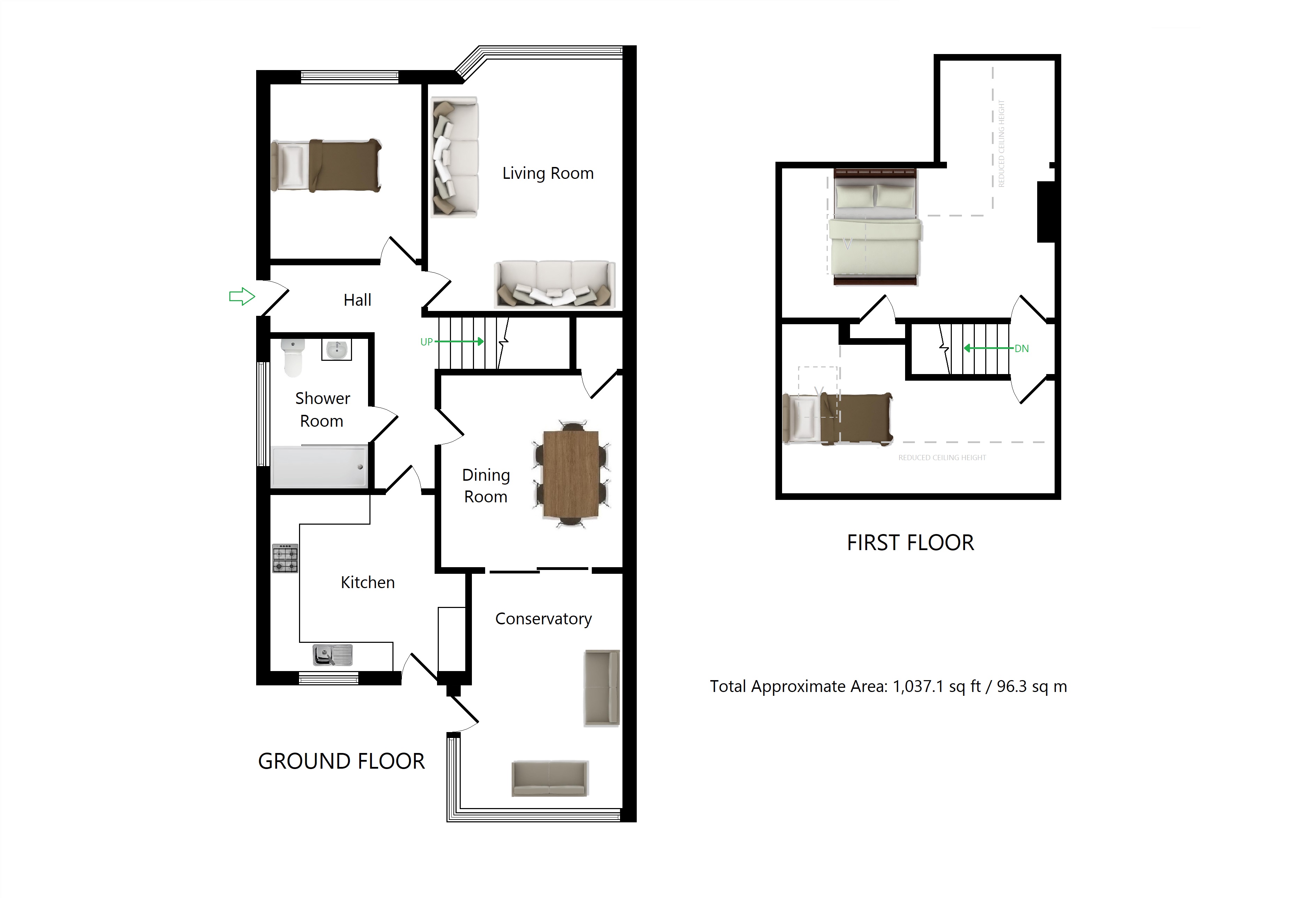 L-shape Hall Living Room: 12'8 x 10'10 (3.86m x 3.30m) plus bay Bedroom: 9'9 x 8'4 (2.97m x 2.54m) Dining Room: 10'7 x 9'10 (3.23m x 3.00m) Conservatory: 11'10 x 7'1 (3.61m x 2.16m) Kitchen: 11'4 x 9'10 (3.45m x 3.00m) at largest Utility Area: 7'3 x 4'6 (2.21m x 1.37m) Shower Room: 8'4 x 5'6 (2.54m x 1.68m)