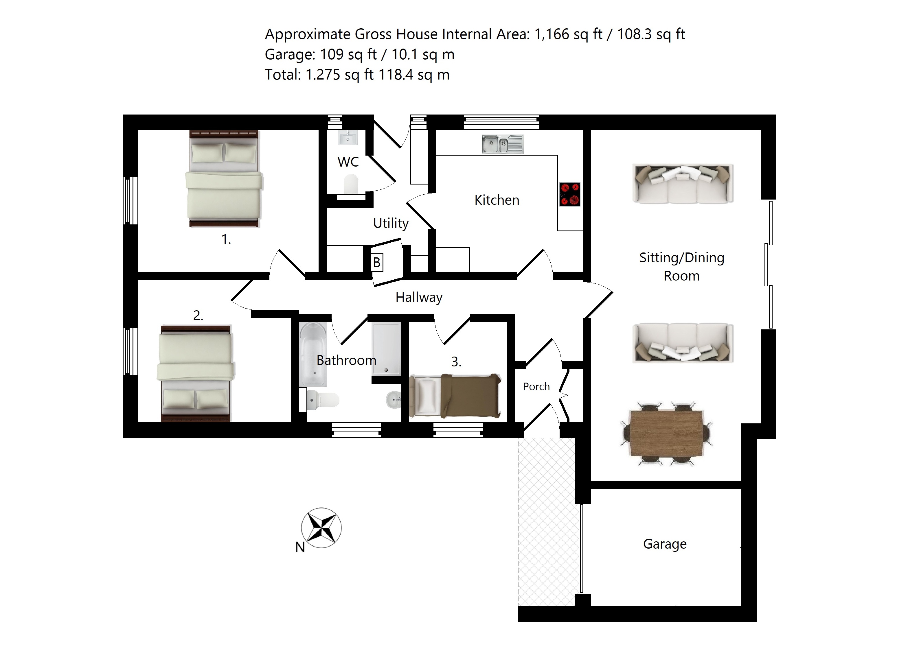 Entrance Porch: 4'3 x 3'9 (1.30m x 1.14m) Entrance Hall: 25'3 x 6'8 (7.70m x 2.03m) Sitting/Dining Room: 27'4 x 13'4 (8.33m x 4.06m) Kitchen: 11'6 x 11'2 (3.51m x 3.40m) Utility: 11'2 x 8'0 (3.40m x 2.44m) at largest Cloakroom Bedroom One: 14'1 x 11'3 (4.29m x 3.43m) Bedroom Two: 11'3 x 12'0 (3.43m x 3.66m) Bedroom Three: 7'10 x 7'9 (2.39m x 2.36m) Bathroom: 8'1 x 7'10 (2.46m x 2.39m)